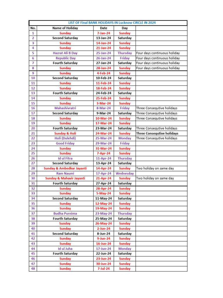 Final Bank Holiday 2024 Lucknow Circle | PDF | Indian Religions